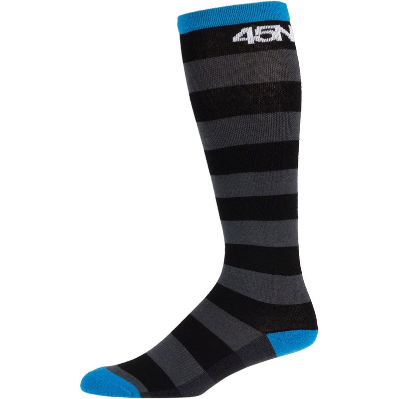 45NRTH Midweight Stripe Knee Wool Sock - Black Large. Our knee-high midweight socks are warm enough to keep the cold at bay but wont add bulk under your Naughtvind bibs. Knee-high coverage eliminates gaps in layers. The Merino wool blend wicks moisture awa