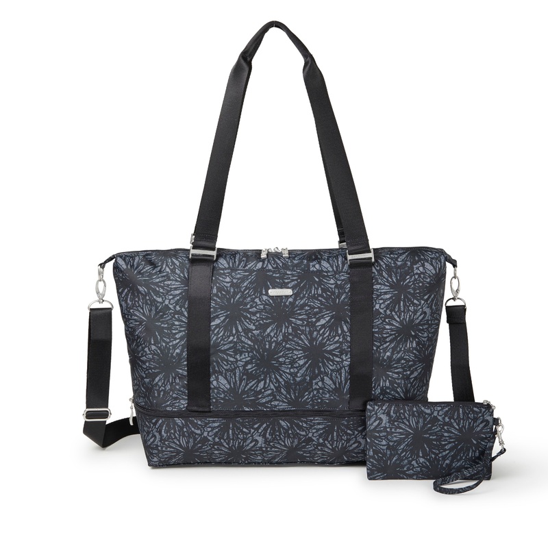 The expandable carry on duffel has everything you need to travel with ease. A roomy, expandable design accommodates souvenirs, while a removable RFID wristlet helps keep your information safe. Slip your luggage handle through the built-in pass-through, and feel confident that your bagg wont slip or fall while you run to make your connection.