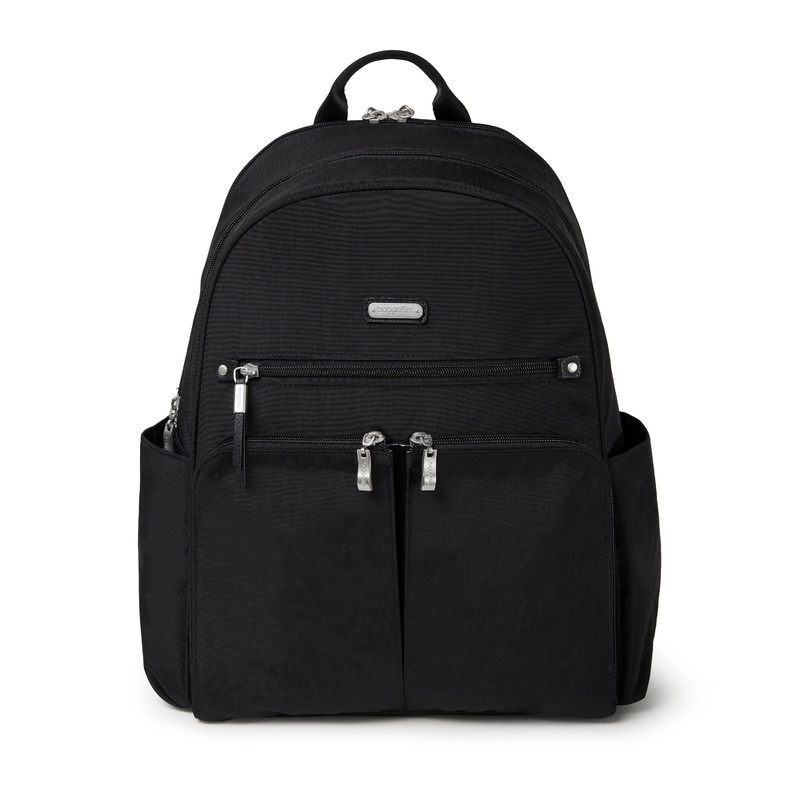 Traveling with your computer? Make your next trip stress-free thanks to the here and there laptop backpack. A padded pocket protects your computer, while multifunctional compartments offer easy storage for cords and everyday essentials. A built-in luggage handle sleeve offers added convenience when you’re traveling with multiple bags, while locking zippers protect your possessions. RFID-protected panels safeguard your personal info and peace of mind, so you can stay focused on the journey ahead.