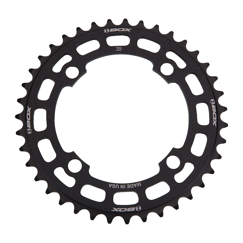 Made in the USA from 6061-T6 aluminum alloy Box Two BMX Chainrings are round and true. They fit 104 BCD four-bolt cranks and are available in black anodized with laser-etched graphics from 38 to 45-teeth TECH SPECSMount Compatibility104mm 4-bolt Teeth39TTy