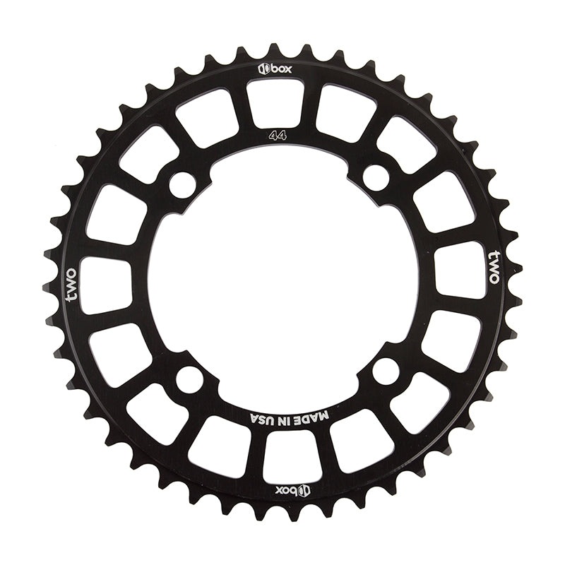 BOX Two BMX Chainring 44T Black. BOX Two chainrings are round and true. They fit 104 BCD four-bolt cranks and are feature a black anodized finish.Durable hard anodized finish3.5mm thickness TECH SPECSTooth Count 44Ring Position/Type SingleDrivetrain Speeds