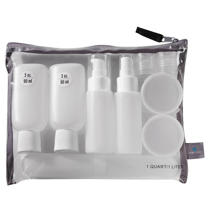 The Pack-It Custom Travel Bottle Set is the perfect customizable carry-on option. Carry all your liquids and gels in this durable reusable one-quart zip top pouch. With four 3 oz. squeeze bottles for liquids or gels, six interchangeable lids, two pill boxes for your prescriptions or vitamins, and a toothbrush holder, we think weve got you covered. This travel solution helps you organize your toiletries and meets 3-1-1 TSA requirements. Packing your toiletry bag has never been easier.