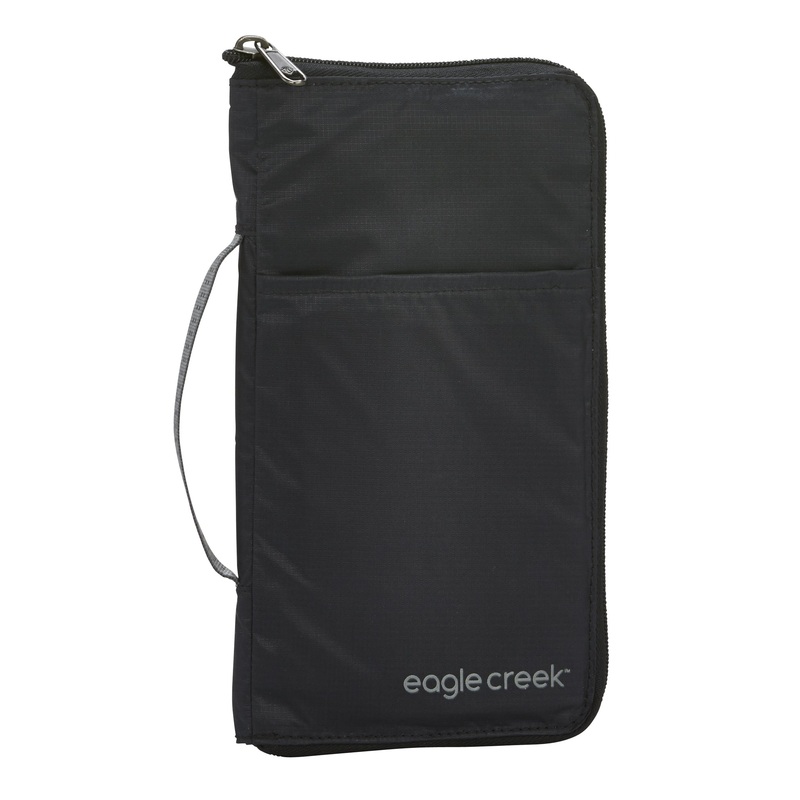 An ultra-light itinerary-sized zippered organizer for world travel; includes organization for Passport, credit cards, and currencies.