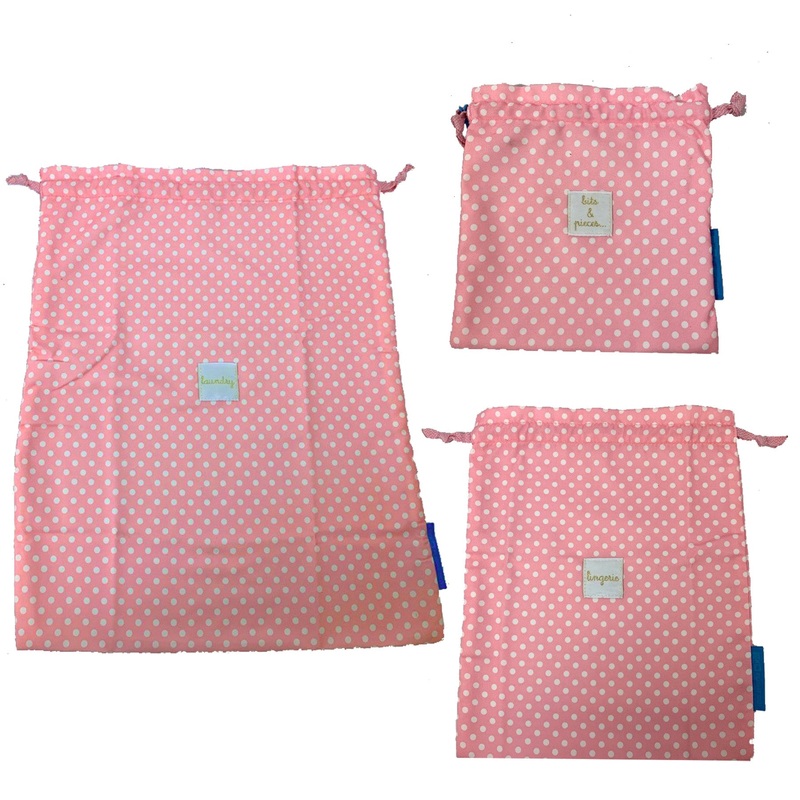 A bag for everything. Set of 3 travel pouches keep everything organized and cute. Labeled 'Bits & Pieces', 'Laundry' and 'Lingerie'