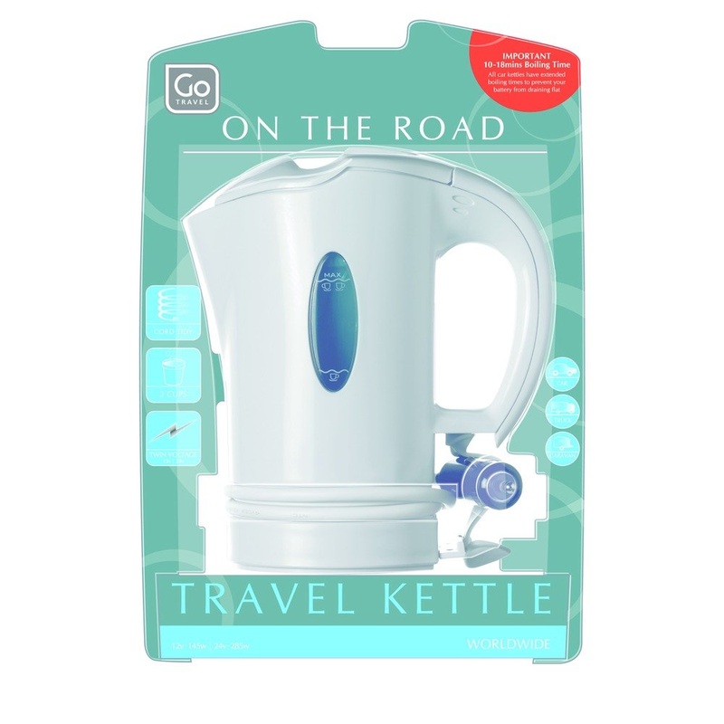 Car Kettle To Go James Russell Lowell said the wise man travels to discover himself. We say I bet the wise also wanted to pull over and make himself a cup of tea without getting out of his car. With 12v/24v power supply and two cups, the Car Kettle to Go would have been the ideal solution. Technical info 12V/24V Travel Kettle for cars, caravans and trucks. Water level window indicates filling capacity. Integral cord and plug storage. Weighs under 500g. Includes 2 stowaway drinking cups approx size: 17cm x 8.5cm Important: 12v power = approx 18 minutes boiling time 24v power = approx 10 minutes boiling time.