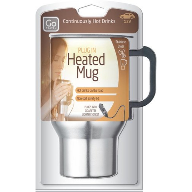Color:Silver Powered by 12V adaptor that plugs into any in-car cigarettelighter, this stainless steel travel mug will keep all drinks piping hotthoughout a long journey. Designed to fit any car cup holder, it can be usedin vans, caravans, boats and motor h