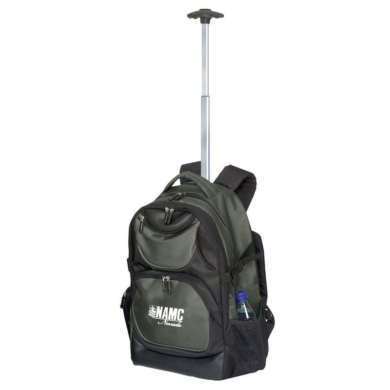 Made of heavy-duty dualtex nylon mixed with 420D jacquard, this stunning,contemporary backpack is cleverly equipped with its unique handle and in-lineskate wheels for easy maneuverability. Features include double compartments, acomputer sleeve inside the main compartment for a computer, and a zipcompartment in front with pockets for palm pilot, phone, cards, pens, keys. Azip pocket and mesh pocket on the sides and soft-grip handle complete thispleasing pack.