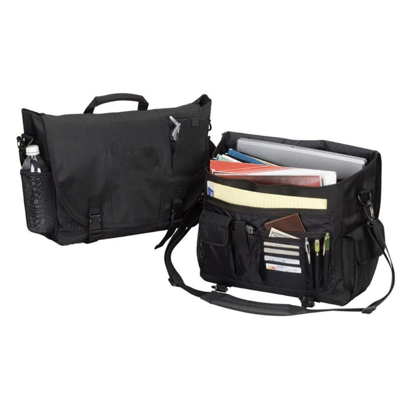 The Goodhope Bags Flap over Laptop Messenger Bag provides the space andorganization you need to carry everything you need to get through your day.This extra-large bag is built to stand up to whatever you need it for. Therectangular bottom sits flat to provide you with easy access to everythinginside. Dimensions: 15.5W x 5.25D x 13H in.. 1680D ballistic nylon. Availablein black. Shoulder strap can be adjusted and removed. Padded storage for alaptop up to 15 in.. Pocket on the flap for easy access to your smartphone.