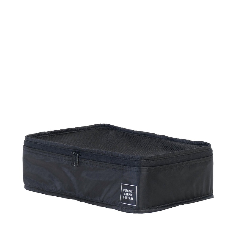 A set of 4 packable Herschel Supply Co. bags. 3 of the bags have mesh fronts, and 1 is rendered in vinyl for easy storage of wet clothes. The wraparound zips open to unlined interior compartments.