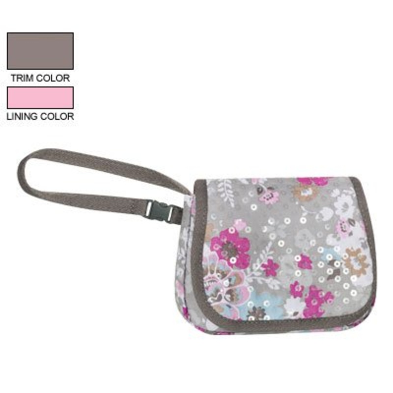 Front flap with magnetic snap closure Zipped main closure under flap 10 in (25.40cm) wristlet strap with quick release clip Exterior front open pocket under flap Interior back wall open pocket