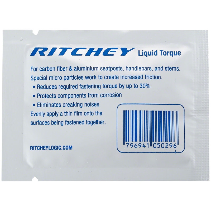 Ritchey Liquid Torque Single Packet. Liquid Torque creates extra friction between 2 surfaces reducing tightening torque required to avoid slippage.Works with carbon titanium aluminum and steelUse where over-clamping can damage componentsProtects against co