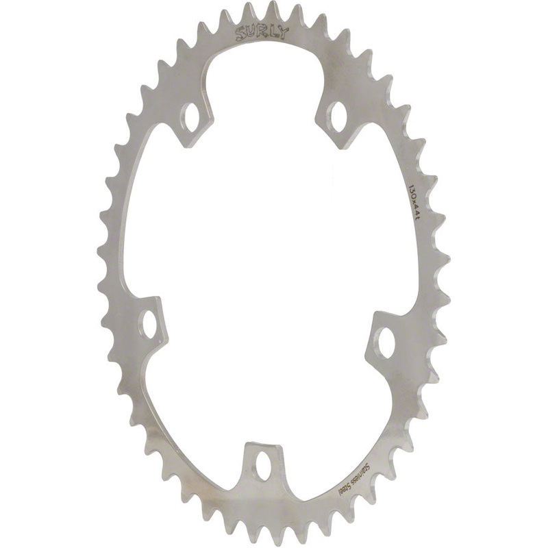 Surly Ring 44t x 130mm Stainless Steel. Surly Stainless 5-bolt ChainringsNo ramps or shift gatesSurly rings paired with 9 speed chains will have a tight fit. No compatibility with 10 or more speed drivetrainsMade from 304 Stainless Steel TECH SPECSColor Si