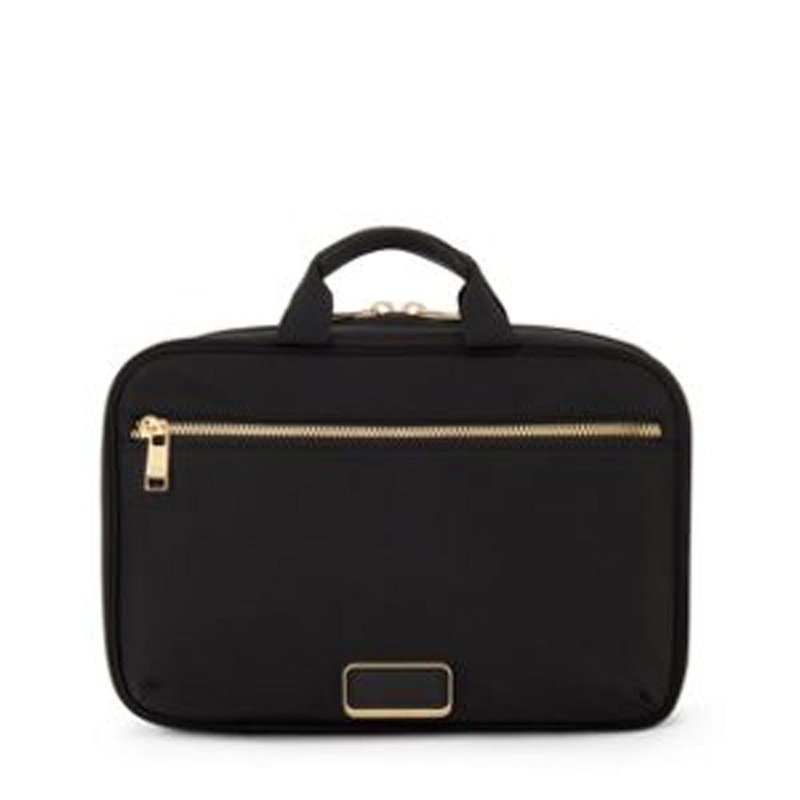 Dont leave home without this travel-ready style. Three transparent interior compartments and a detachable pouch create optimal organization. Lay it flat or hang from a fixture when open.